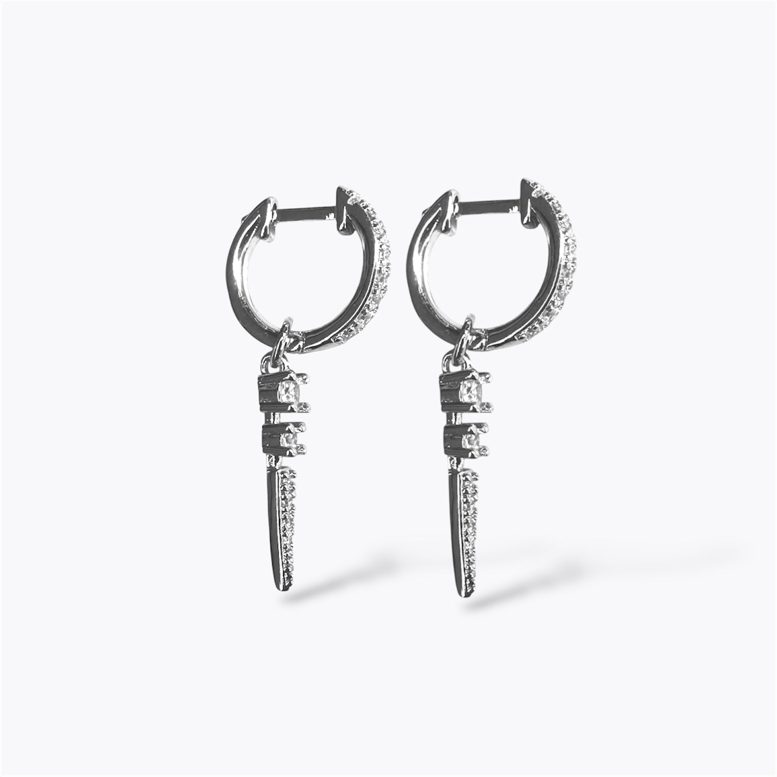 A stunning combination of elegance and modern design, these earrings feature sleek, elongated spires adorned with radiant crystals that shimmer with every movement. The striking geometric shape and brilliant sparkle make them a perfect statement piece, adding a touch of sophistication and luxury to any ensemble. Let these earrings elevate your style with their bold yet refined beauty.